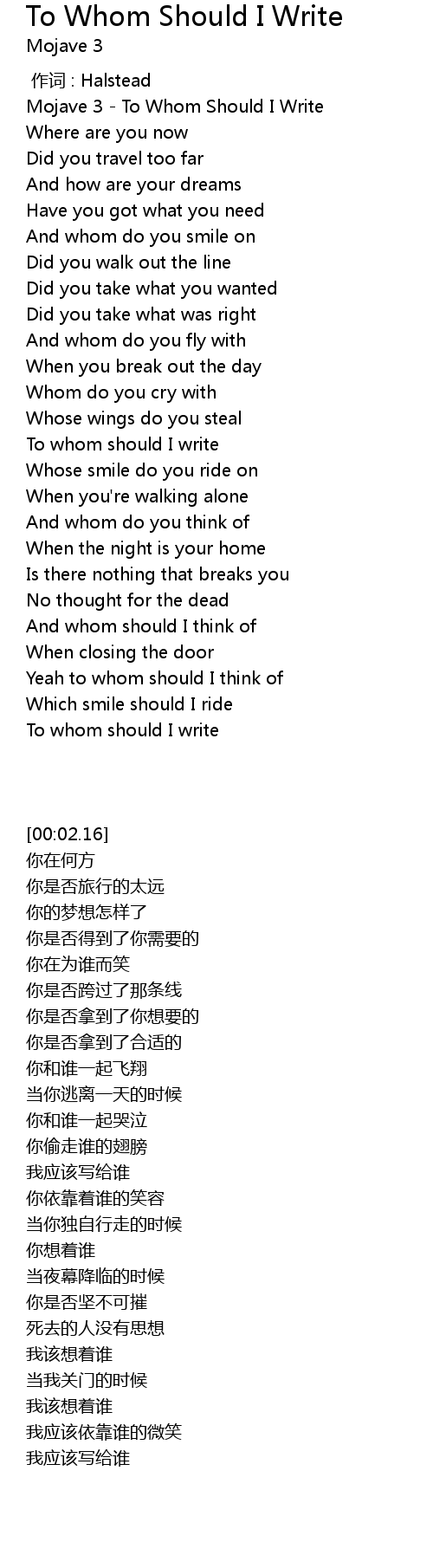 | [00:02.16] | Mojave 3 - To Whom Should I Write |