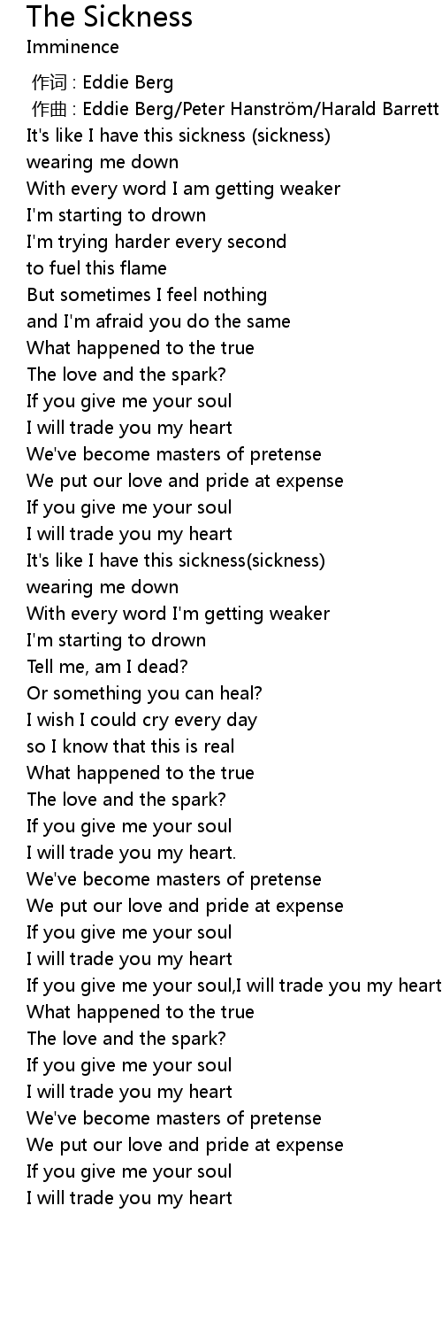 | [00:32.22] | It's like I have this sickness (sickness) |