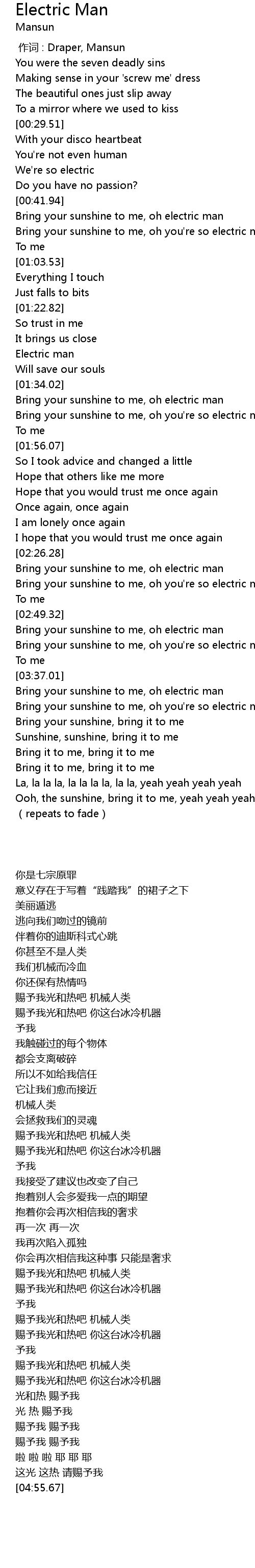 | [03:56.68] | Bring your sunshine to me, oh you' re so electric man |