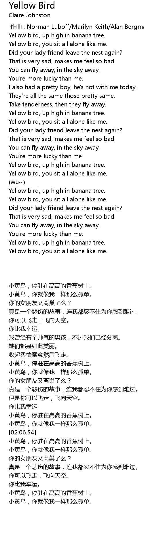 | [02:32.72] | Yellow bird, you sit all alone like me. |