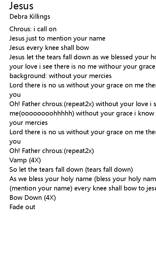 Jesus let the tears fall down as we blessed your holy name (repeat2x) without your love i see there is no me withour your grace i see there is no love background: without your mercies |