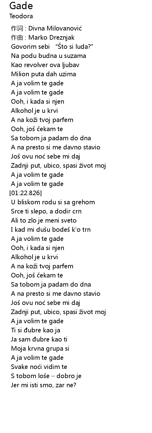 | [01:45.769] | I kad mi dušu bodeš k'o trn |
