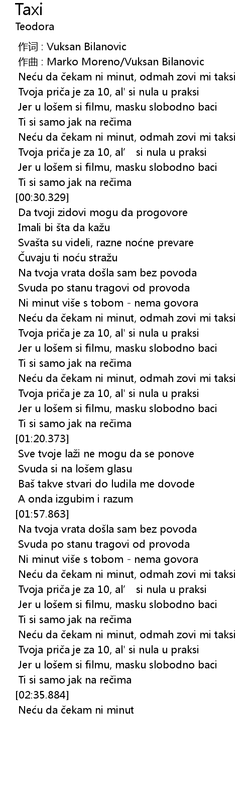 | [01:06.951] | Ne u da ekam ni minut, odmah zovi mi taksi |