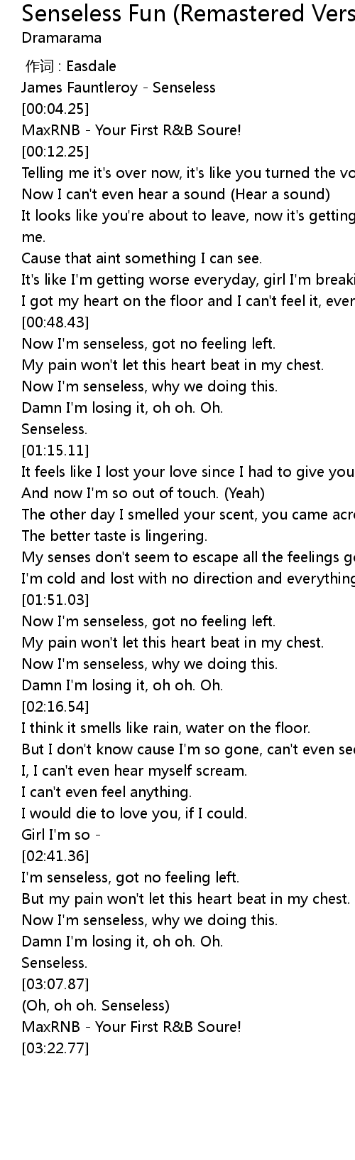 | [00:49.37] | Now I' m senseless, got no feeling left. |