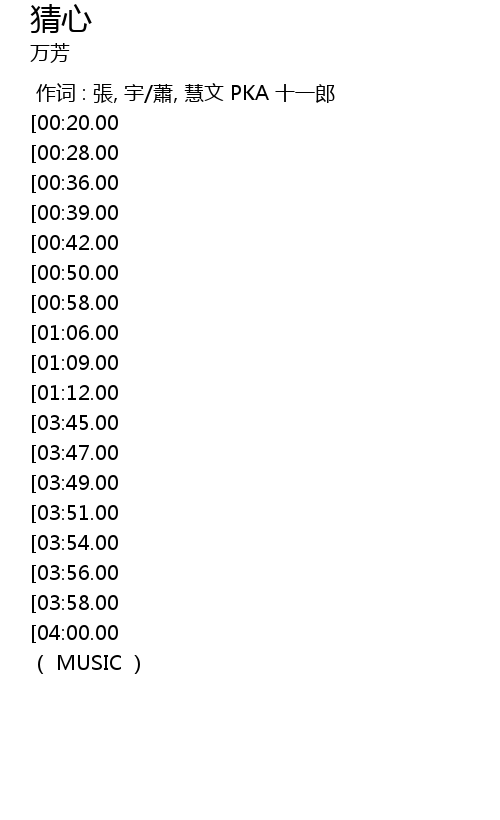 | [02:57.00][01:06.00] | wèn nǐ xīn xiǎng shén me |