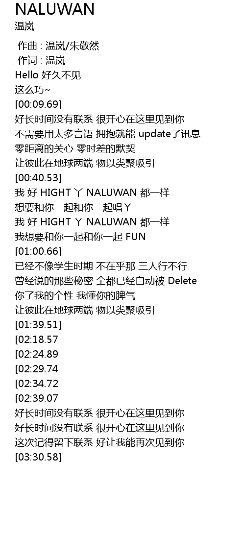 | [02:40.04][02:18.57][01:40.43] | 我 好 HIGHT ㄚ NALUWAN 都一样 |
