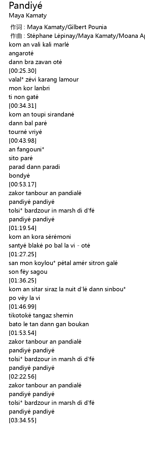 | [00:00.000] | 作词 : Maya Kamaty/Gilbert Pounia |