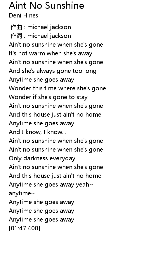| [00:36.300] | Ain' t no sunshine when she' s gone |