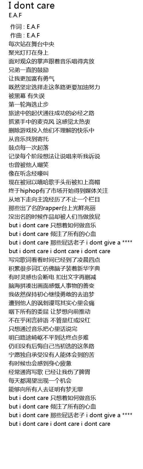 | [01:12.98] | but i dont care 那些屁话老子 i dont give a **** |