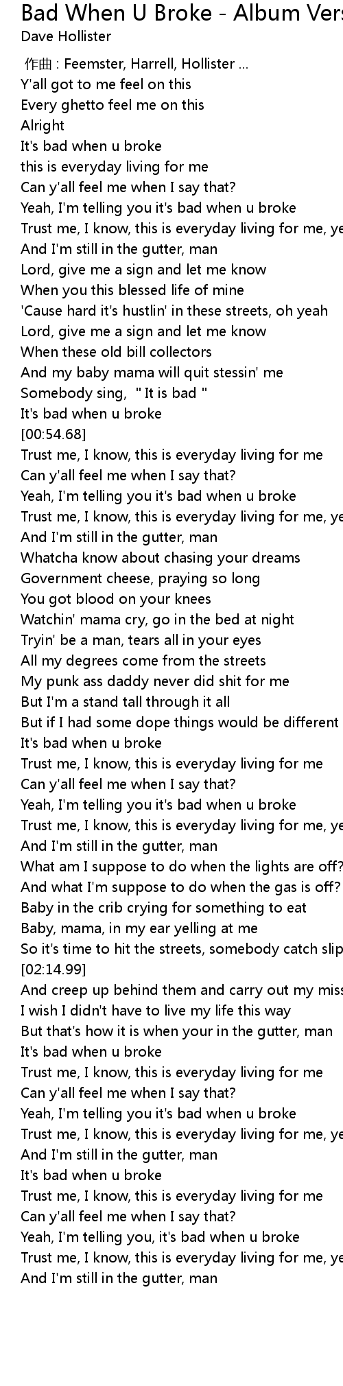 | [01:48.91] | Yeah, I'm telling you it's bad when u broke |