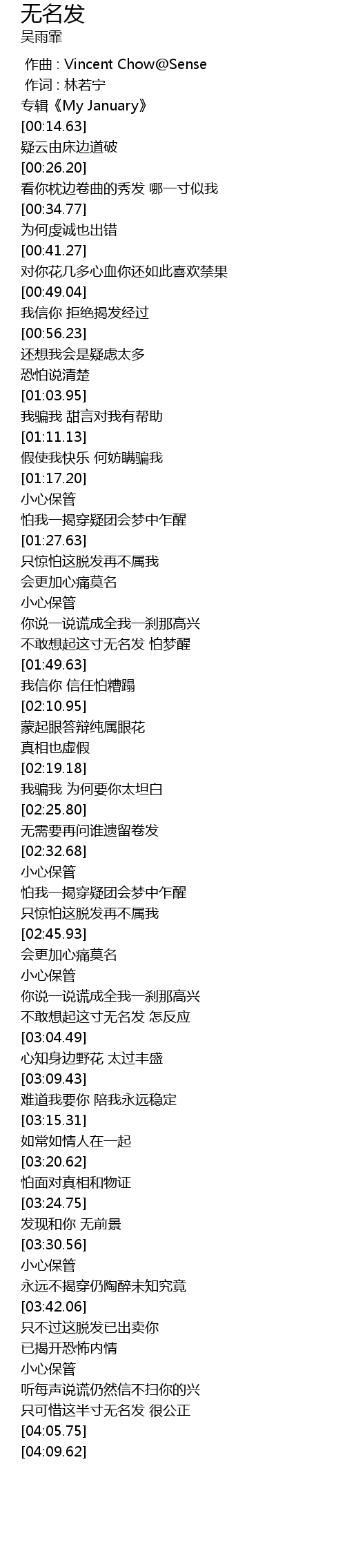 | [02:57.18] | 不敢想起这寸无名发 怎反应 |
