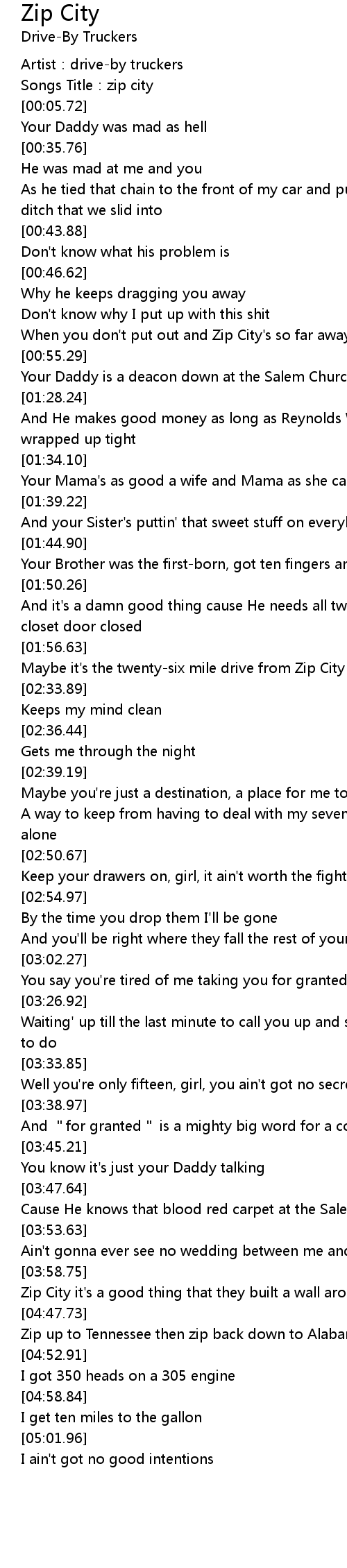 | [00:52.55] | When you don' t put out and Zip City' s so far away |