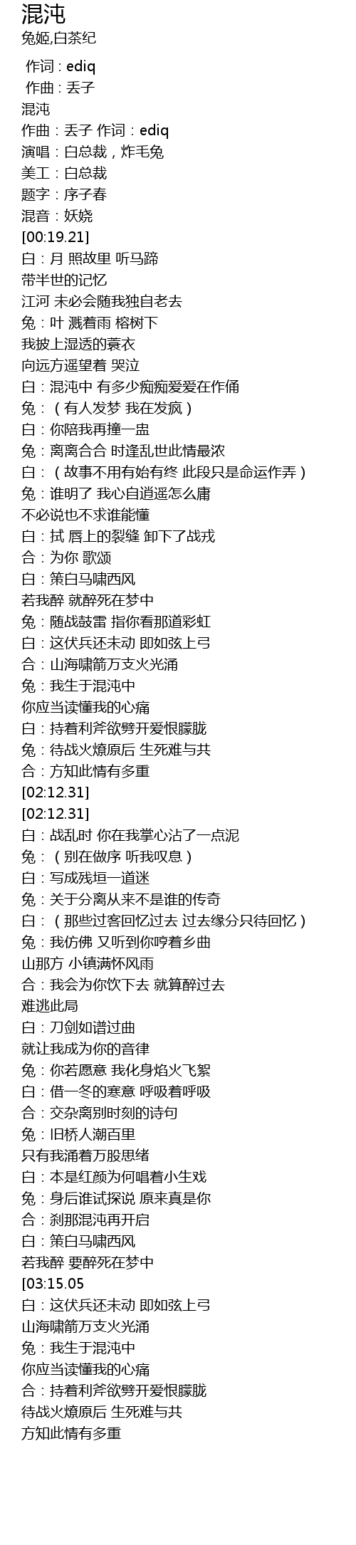 | [00:59.44] | 白:混沌中 有多少痴痴爱爱在作俑 |