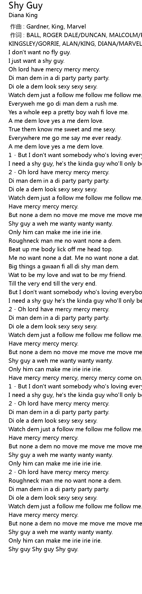 | [02:47.72] | I need a shy guy, he′s the kinda guy who′ll only be mine. |