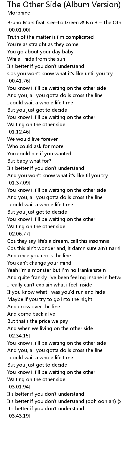 | [00:00.00] | Bruno Mars feat. Cee-Lo Green & B.o.B – The Other Side |