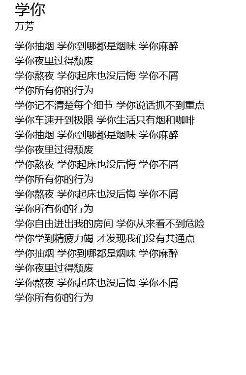 | [00:38.450] | 学你熬夜 学你起床也没后悔 学你不屑 学你所有你的行为 |