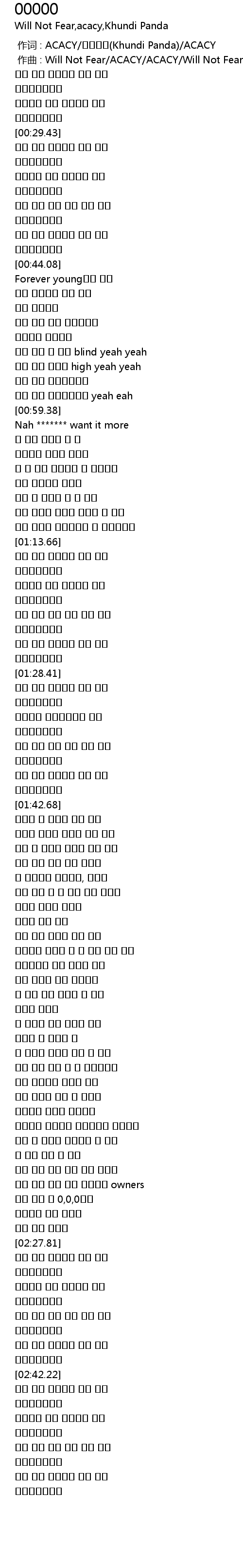 | [00:01.000] | 作曲 : Will Not Fear/ACACY/ACACY/Will Not Fear |