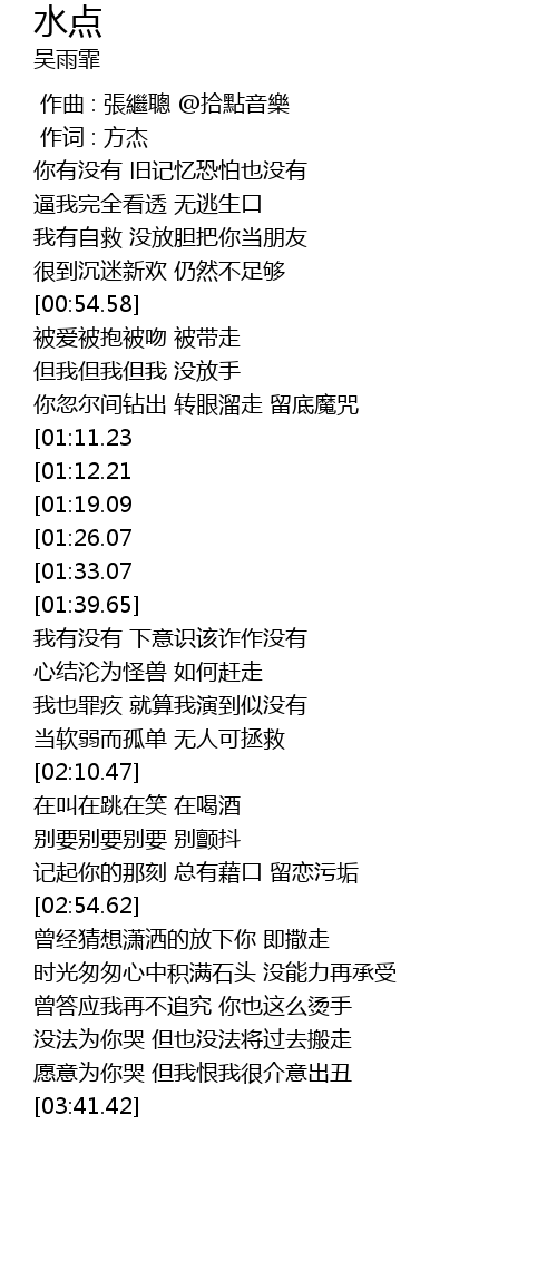 | [02:34.61][01:19.09] | 谁把玻璃水点 握到拳头 在期待更难受 |