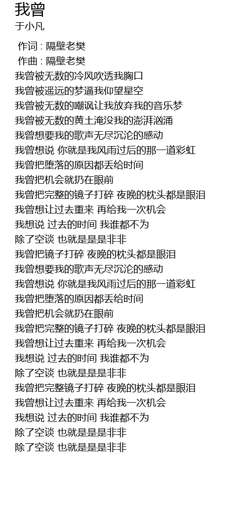 | [00:00.000] | 作词 : 隔壁老樊 |