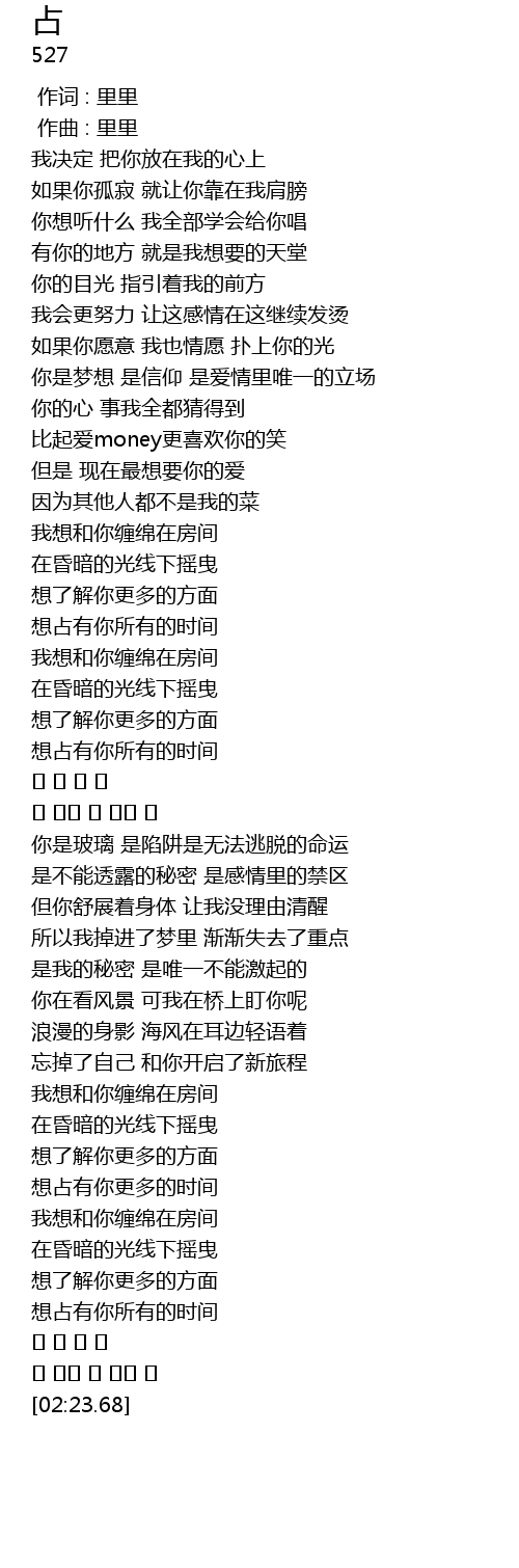 | [01:09.96] | xiǎng zhàn yǒu nǐ suǒ yǒu de shí jiān |