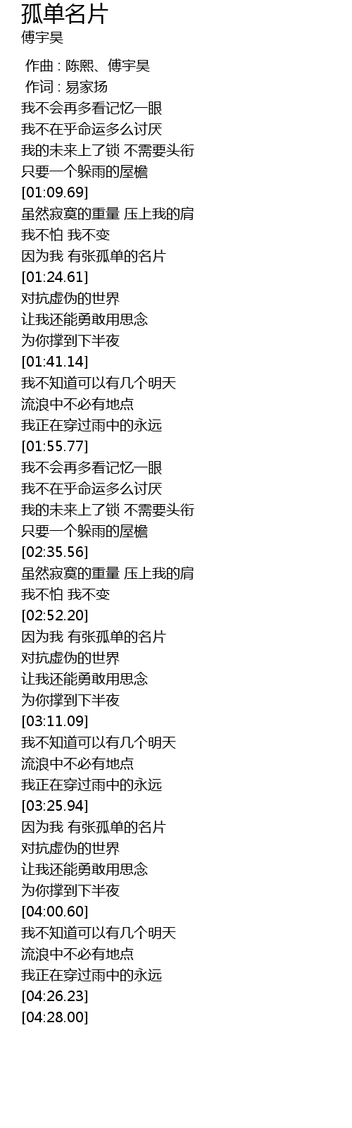 | [01:24.25] | 因为我 有张孤单的名片 |
