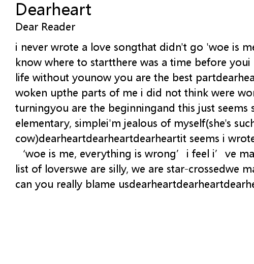 | i never wrote a love songthat didn' t go ' woe is me, everything is wrong' i don' t know where to startthere was a time before youi kinda forgot what that was like, life without younow you are the best partdearheartdearheartdearheartand now i' ve woken upthe parts of me i did not think were workinga cog in something turningyou are the beginningand this just seems so naturalso unrehearsed, so elementary, simplei' m jealous of myself she' s such a lucky cow dearheartdearheartdearheartit seems i wrote a love songthat doesn' t go ' woe is me, everything is wrong' i feel i' ve made a startwe' ve joined the list of loverswe are silly, we are starcrossedwe make other people hate usbut can you really blame usdearheartdearheartdearheart |