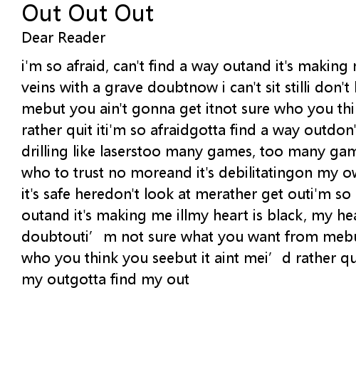 | i' m so afraid, can' t find a way outand it' s making me illyou have injected my veins with a grave doubtnow i can' t sit stilli don' t know what you want from mebut you ain' t gonna get itnot sure who you think you see, but it ain' t mei' d rather quit iti' m so afraidgotta find a way outdon' t look at meyour eyes are drilling like laserstoo many games, too many gamestoo many playersi' m not sure who to trust no moreand it' s debilitatingon my own what i' ve got it' s smallbut it' s safe heredon' t look at merather get outi' m so afraid, can' t find my way outand it' s making me illmy heart is black, my heart is dark and full of doubtouti' m not sure what you want from mebut you ain' t gonna get itnot sure who you think you seebut it aint mei' d rather quit iti' m so afraidgotta find my outgotta find my out |