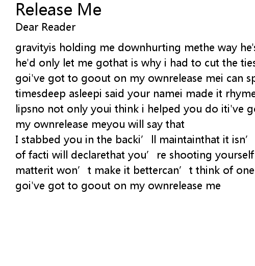 | gravityis holding me downhurting methe way he's pushing me aroundi could flyif he'd only let me gothat is why i had to cut the ties i hope he knowsi've got to goi've got to goout on my ownrelease mei can speaki formed the words so many timesdeep asleepi said your namei made it rhymeonly youput this tape across my lipsno not only youi think i helped you do iti've got to goi've got to goout on my ownrelease meyou will say that | |