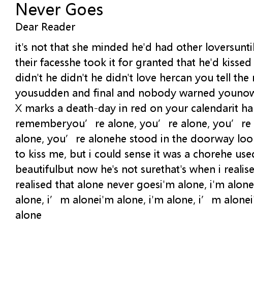 | X marks a deathday in red on your calendarit haunts to ensure that you always rememberyou' re alone, you' re alone, you' re aloneyou' re alone, you' re alone, you' re alonehe stood in the doorway looking right through mehe lent in to kiss me, but i could sense it was a chorehe used to tell me that i was beautifulbut now he' s not surethat' s when i realised i' m all alonethat' s when i realised that alone never goesi' m alone, i' m alone, i' m alonei' m alone, i' m alone, i' m alonei' m alone, i' m alone, i' m alonei' m alone, i' m alone, i' m alone |