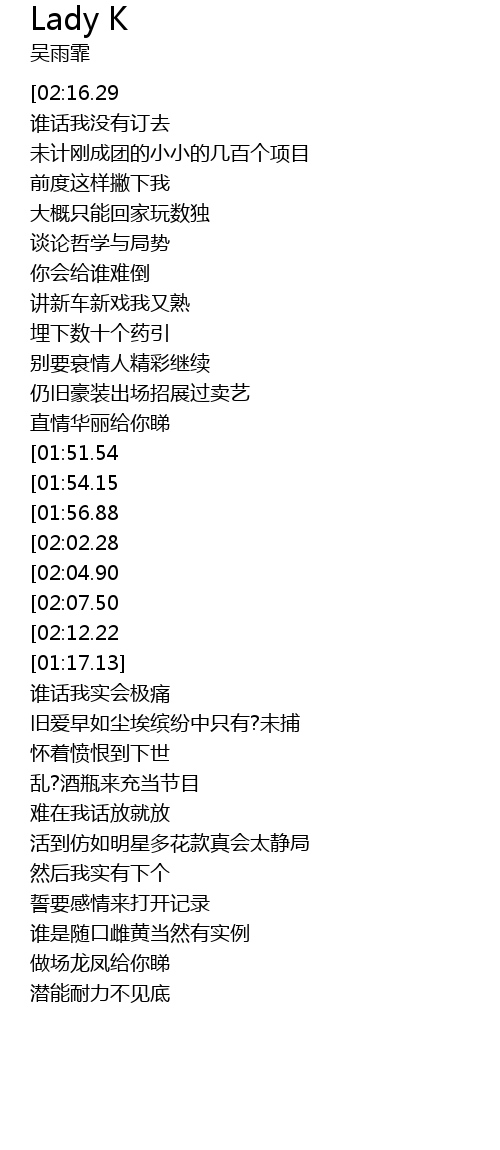 | [00:15.00][02:16.29][03:17.59] | 吴雨霏-LADY K(粤) |