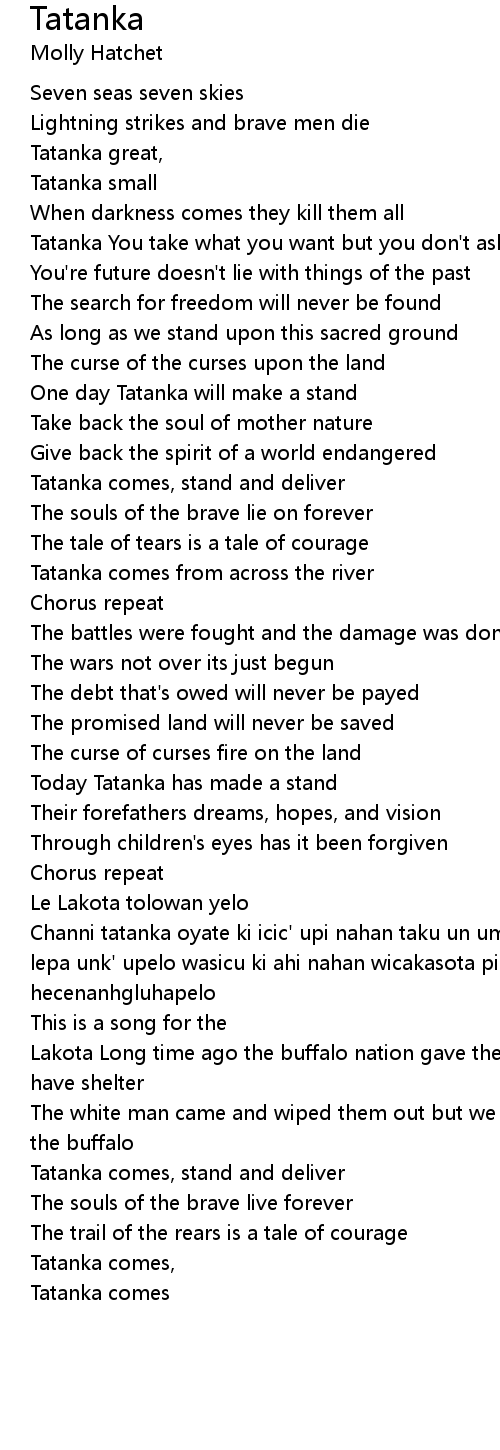 Channi tatanka oyate ki icic' upi nahan taku un umnipi nahan unkotipi kte k'un lepa unk' upelo wasicu ki ahi nahan wicakasota pi tka tatanka tawowakan ki lena hecenanhgluhapelo |