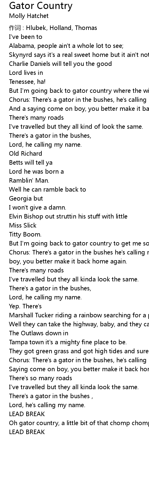 | Chorus: There's a gator in the bushes he's calling my name. and saying come on boy, you better make it back home again. | |