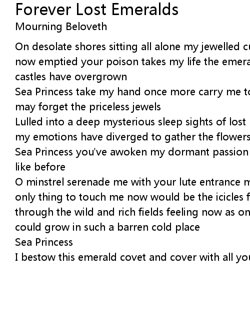 On desolate shores sitting all alone my jewelled cup had once been overflowing now emptied your poison takes my life the emerald has now turned to stone our castles have overgrown |
