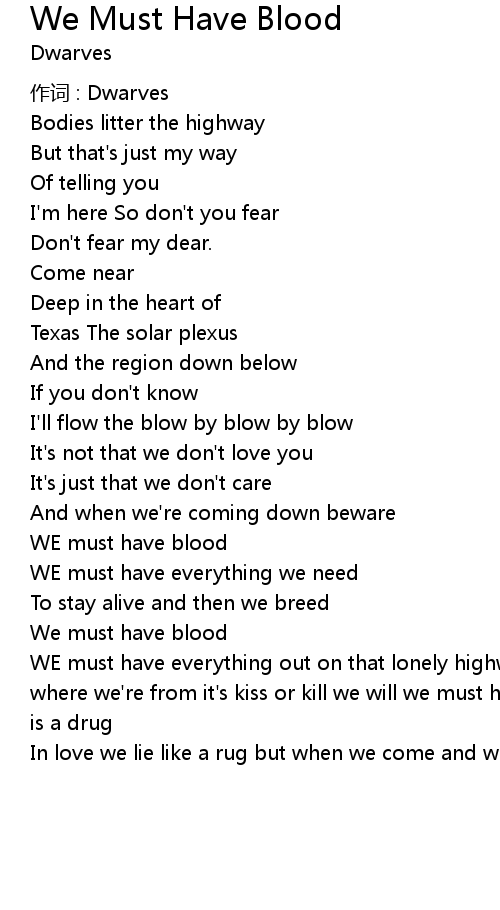 | WE must have everything out on that lonely highway out looking for a thrill and where we' re from it' s kiss or kill we will we must have blood they say that love is a drug | |