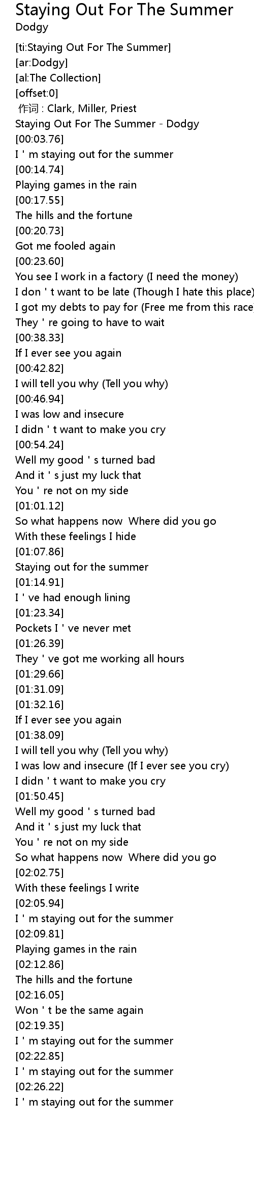 | [00:00.97] | Staying Out For The Summer Dodgy |