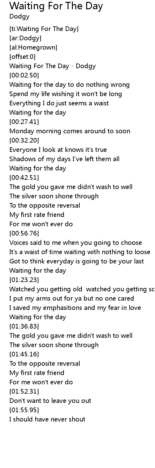 | [00:15.42] | Waiting for the day to do nothing wrong |