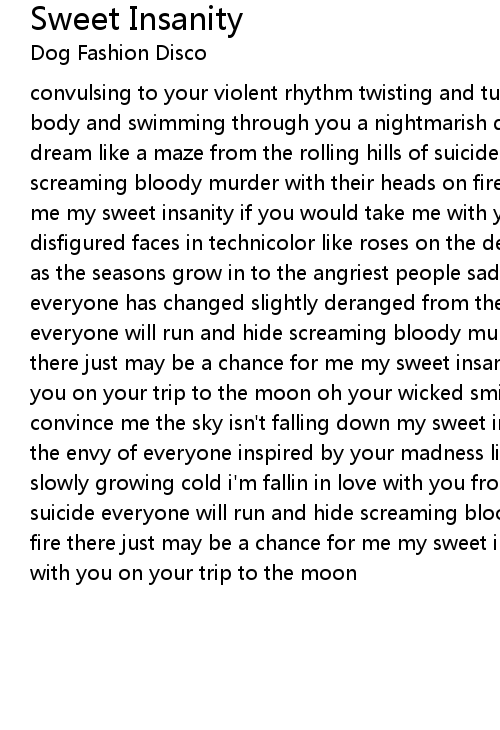 convulsing to your violent rhythm twisting and turning en utero i'm out of my body and swimming through you a nightmarish dream like a maze dream like a maze dream like a maze from the rolling hills of suicide everyone will run and hide screaming bloody murder with their heads on fire there just may be a chance for me my sweet insanity if you would take me with you on your trip to the moon disfigured faces in technicolor like roses on the death bed of your dying mother as the seasons grow in to the angriest people sadistic and slightly deranged everyone has changed slightly deranged from the rolling hills of suicide everyone will run and hide screaming bloody murder with their heads on fire there just may be a chance for me my sweet insanity if you would take me with you on your trip to the moon oh your wicked smile oh your evil ways won't convince me the sky isn't falling down my sweet insanity look what we've become the envy of everyone inspired by your madness like furious wind in a storm slowly growing cold i'm fallin in love with you from the rolling hills of suicide everyone will run and hide screaming bloody murder with their heads on fire there just may be a chance for me my sweet insanity if you would take me with you on your trip to the moon |