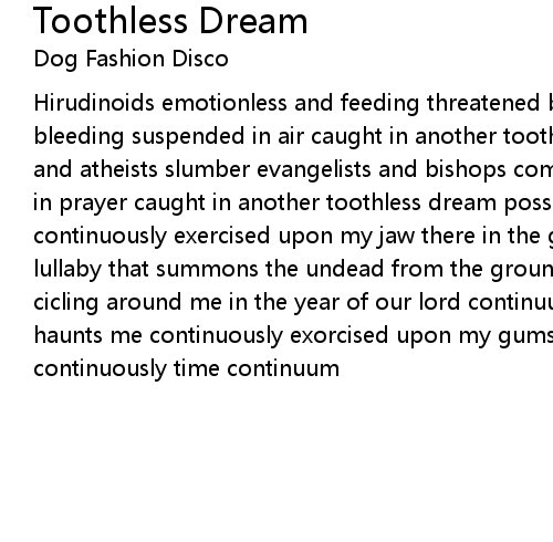 Hirudinoids emotionless and feeding threatened by anemia i am helpless and bleeding suspended in air caught in another toothless dream when pagans sleep and atheists slumber evangelists and bishops come to comfort one another silent in prayer caught in another toothless dream possesion by twilight haunts me continuously exercised upon my jaw there in the garden the serpent sings a lullaby that summons the undead from the ground as vampires and zombies begin cicling around me in the year of our lord continuum possession by twilight haunts me continuously exorcised upon my gums possession by twilight haunts me continuously time continuum |