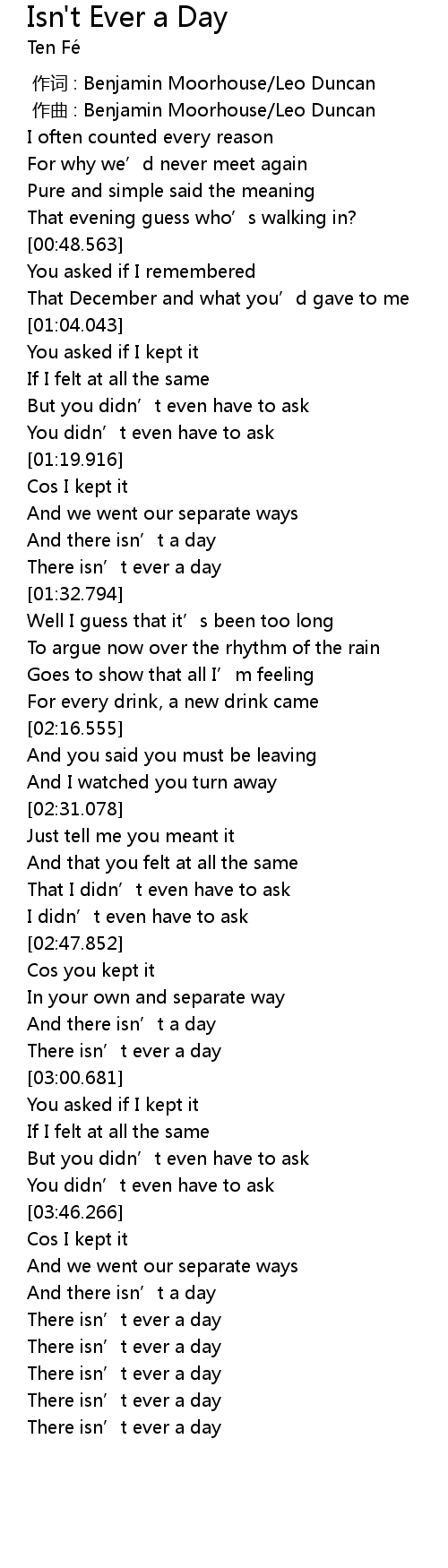 | [00:00.000] | zuo ci : Benjamin Moorhouse Leo Duncan |