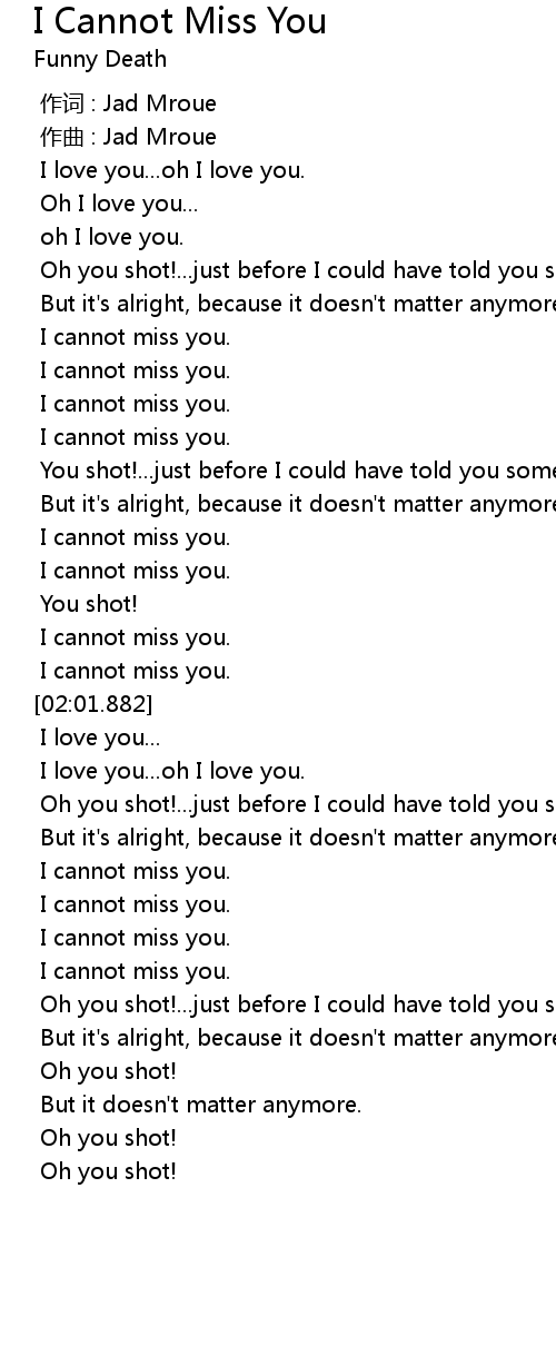 | [01:02.883] | I cannot miss you. |