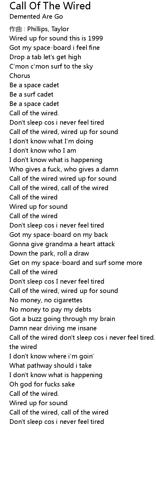 | Call of the wired don' t sleep cos i never feel tired. Call of the wired, call of the wired | |