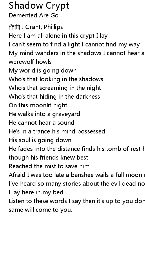 | My mind wanders in the shadows I cannot hear a sound, a zombie screams and a werewolf howls | |