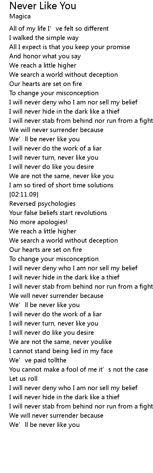 | [02:34.65] | I will never deny who I am nor sell my belief |