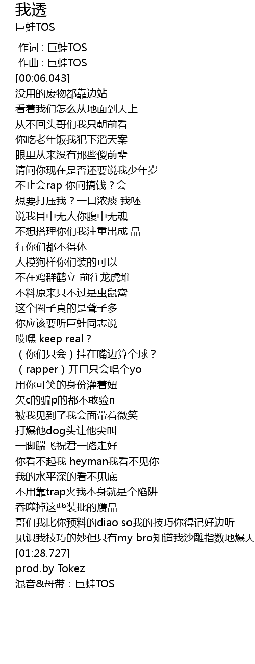 | [01:30.727] | 混音&母带:巨蛙TOS |