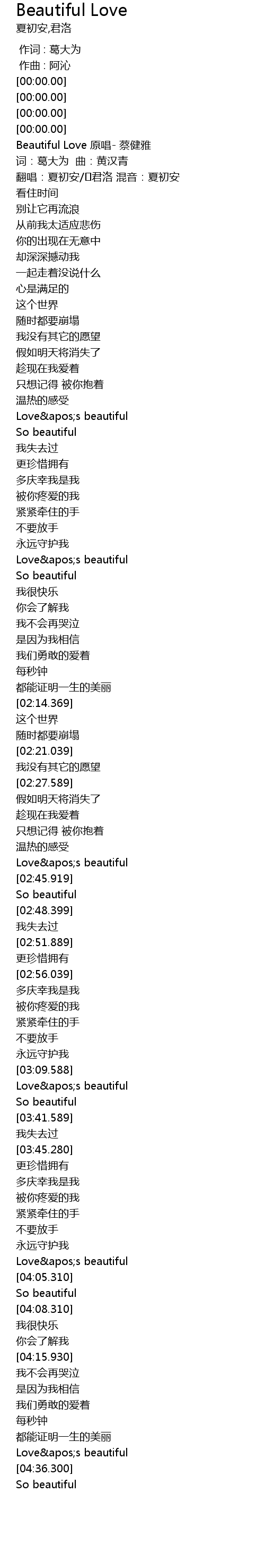 | [00:00.00] | Beautiful Love 原唱- 蔡健雅 |