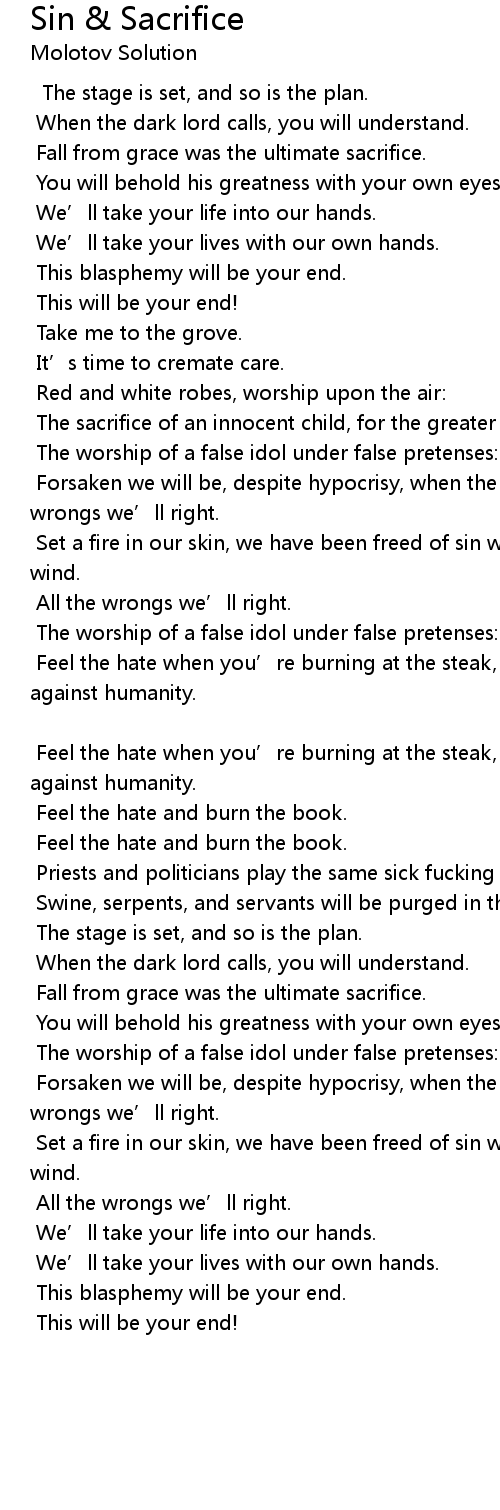 | Feel the hate when you' re burning at the steak, crucified for your crimes against humanity. | |
