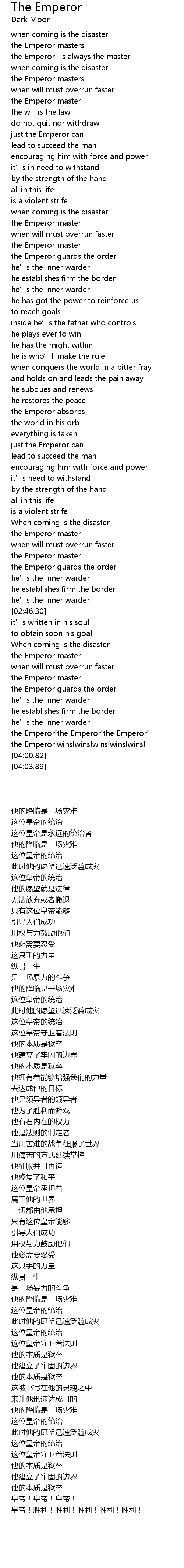 | [03:54.64] | the Emperor!the Emperor!the Emperor! |