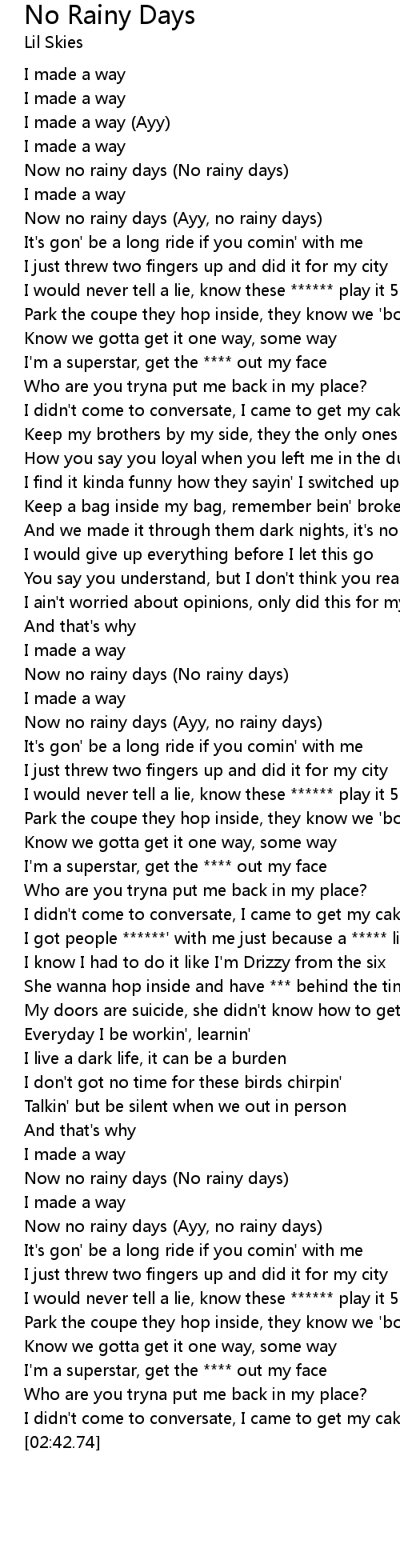 | [00:19.58] | Now no rainy days (Ayy, no rainy days) |