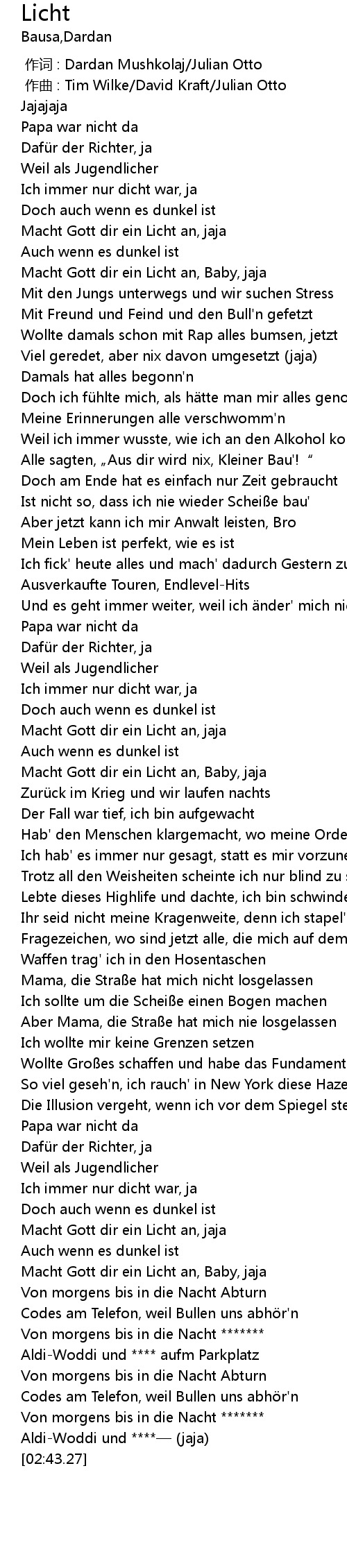 | [02:21.80] | Macht Gott dir ein Licht an, Baby, jaja |