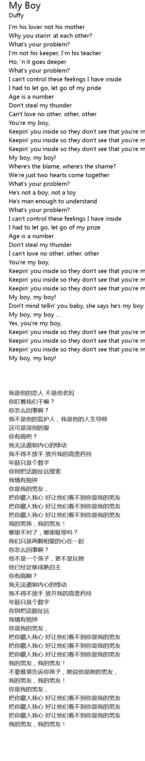 | [02:31.270] | Don't mind tellin' you baby, she says he's my boy |